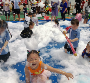 热身活动开始,孩子们跟随动感十足的《鲨鱼鲨鱼》音乐旋律嗨起来,他们一边手舞足蹈,一边高举手中的水枪,让它变成快乐发射器。家长们手中的彩盆也舞动起来,把快乐尽情泼洒。一时间,只见现场水花四溅,水柱起舞,纵横交错,水珠和水雾弥漫开来,共同编织成无数彩色的童话。水上大战中硝烟未散,“梦幻泡沫”活动又如约开启,“泡沫之乐”将此次活动推向高潮。一瞬间,蔚蓝的“湖泊”中,洁白的“浪花”——泡沫不断翻涌,孩子们沐浴在魔幻般的泡泡的世界里,尽情追逐,尽情抛洒。这时,神奇的一幕出现在眼前:阳光之下,只见那些泡沫纷纷飘飞,竟然幻化成千千万万朵“彩云”,或被孩子们捧在手里,或萦绕在孩子们身旁;清风徐来,只见朵朵“彩云”翩翩起舞,或乘风飞翔,场面无比奇妙,无限壮观!当大家还沉浸在“彩云”之中,亲子互动——“捉泥鳅”活动又精彩播放,掀起无尽快乐。置身其中,孩子们快乐无比,家长们激动不已!
